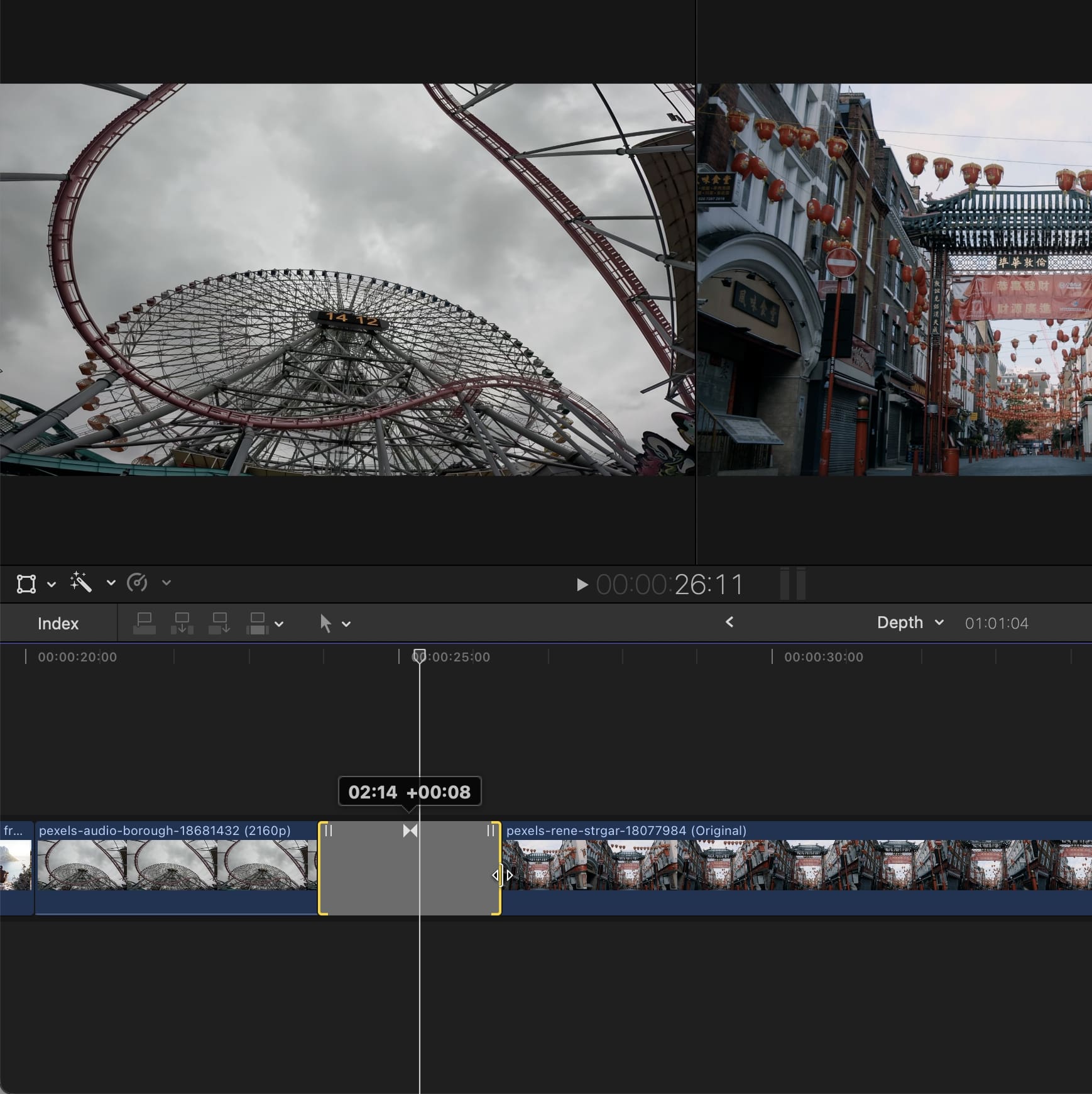 When changing the transition duration, video rendering can become choppy, and certain images may be skipped during rendering, affecting the smoothness of the transition. For now, you can adjust the default transition duration (Final Cut Pro > Settings > Editing) to avoid the issue.