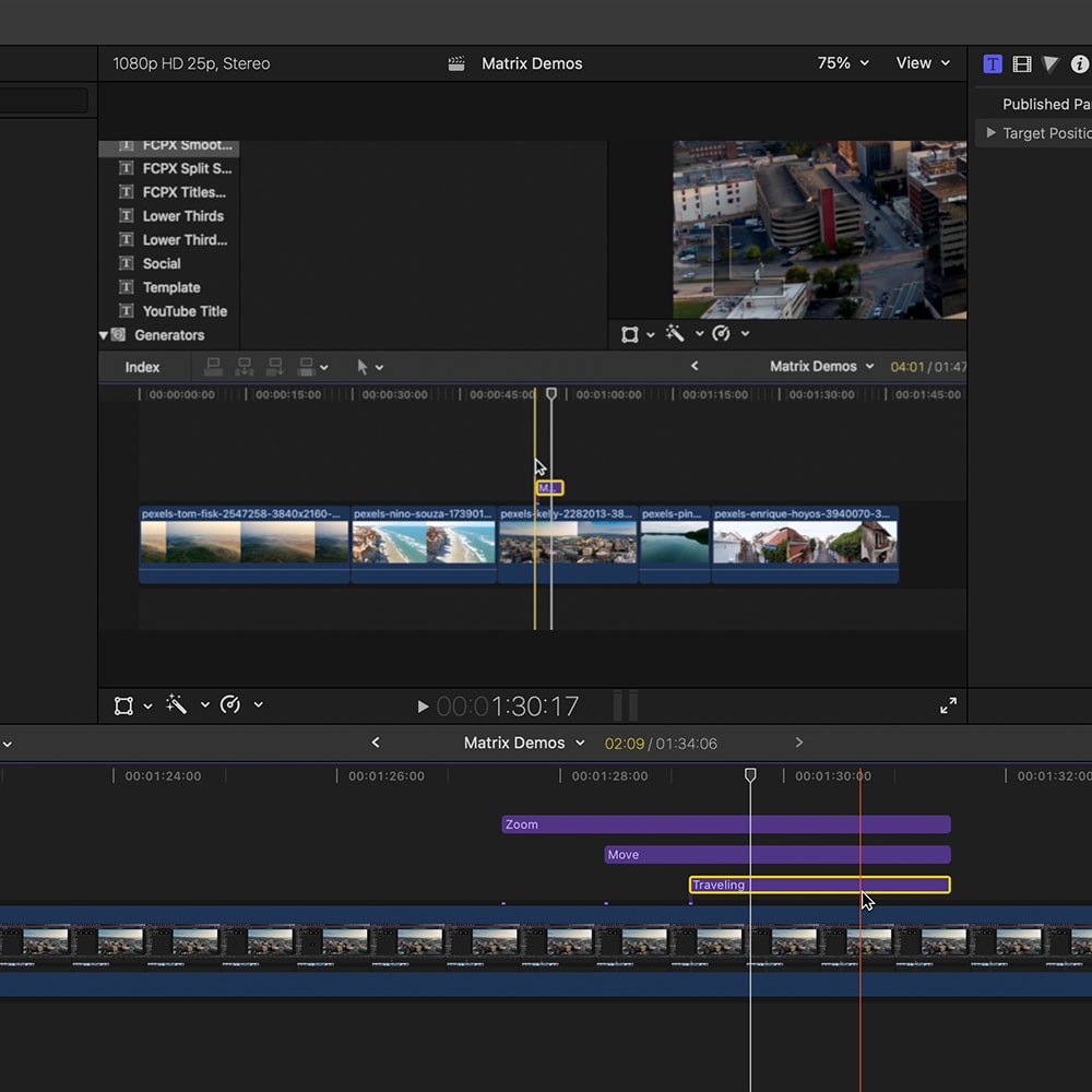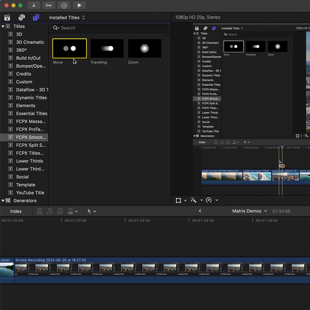 Say goodbye to complicated keyframes and hello to smooth and professional movements in Final Cut Pro with Smooth Motion titles. With 3 basic movements - zoom, move, and traveling - you can easily overlay these titles and create infinite combinations without any animation skills required. Perfect for editing tutorials, our simple drag and drop system makes it easy to use. Get a much more polished result in less time with Smooth Motion Studio