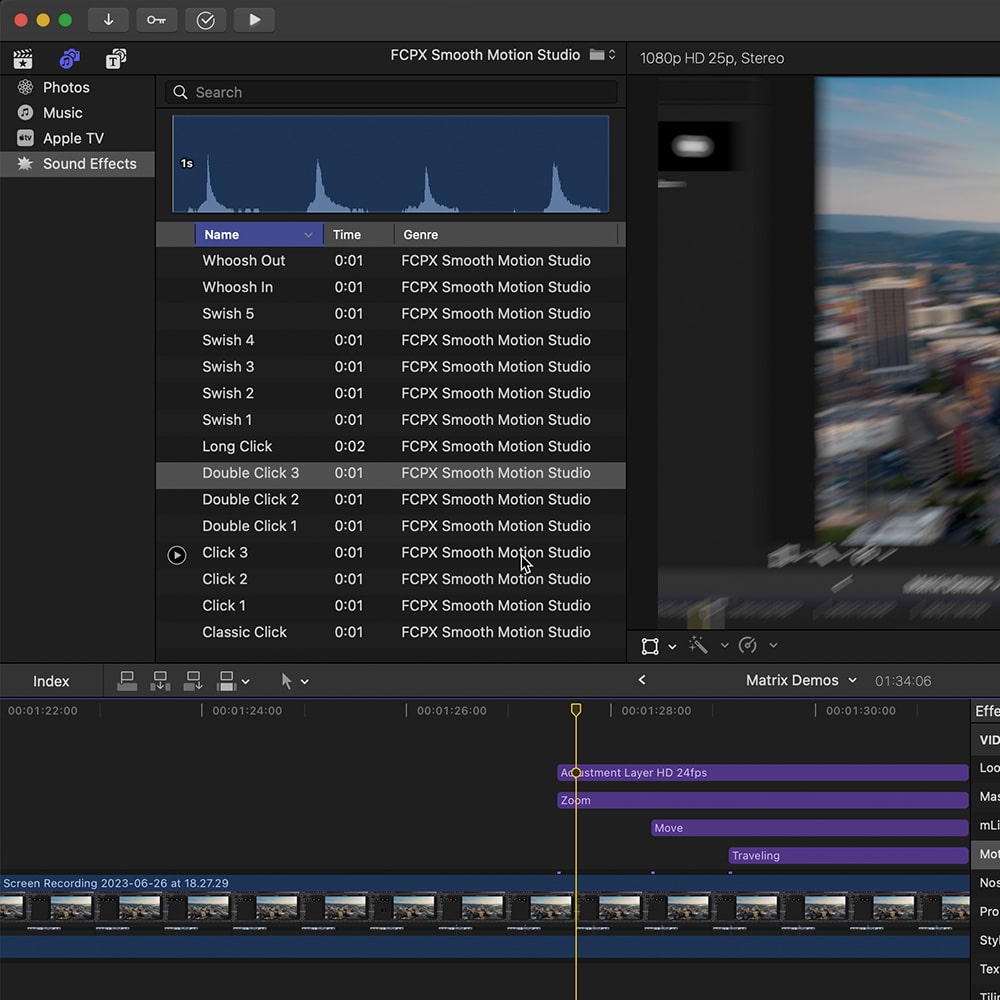 Bring your motion graphics to life with 15 sound effects included in the pack. Once the plugin installed, navigate to the Final Cut Pro sound effects inspector to discover a new Smooth Motion category. Enjoy a selection of whoosh, swish and computer sound effects.